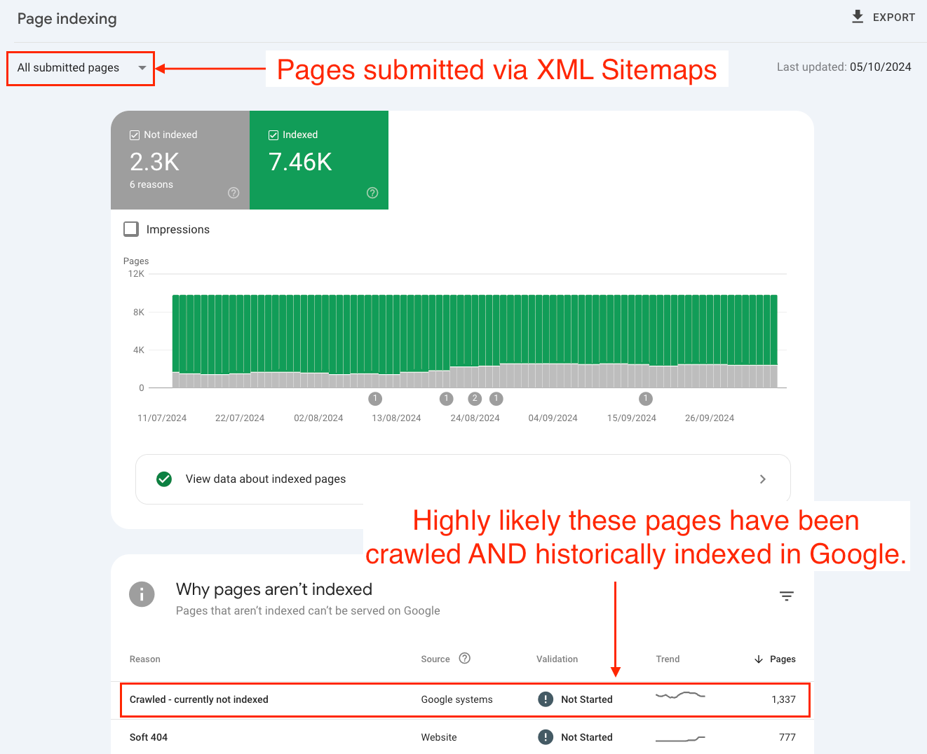 For example, when testing pages submitted via XML sitemaps from alpha testers, 70-80% of pages with the ‘crawled — currently not indexed’ status in GSC had been historically indexed.