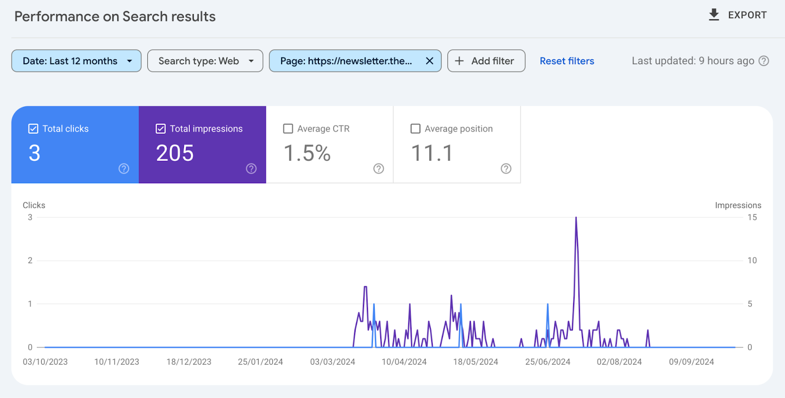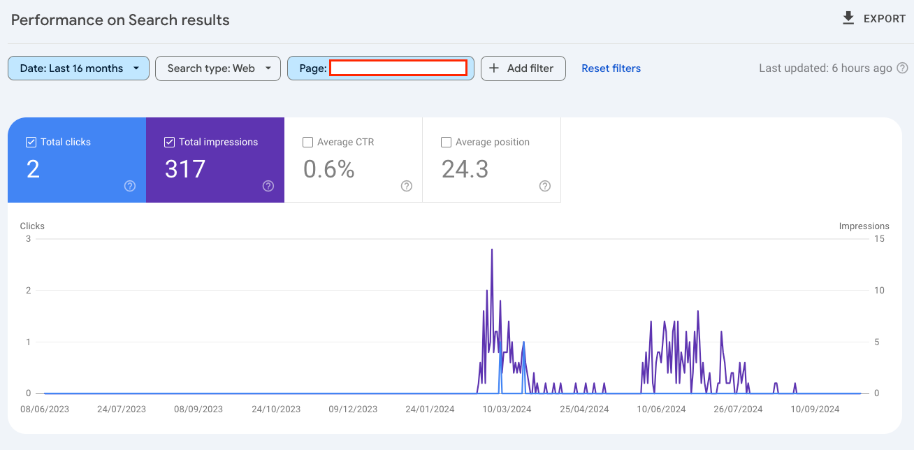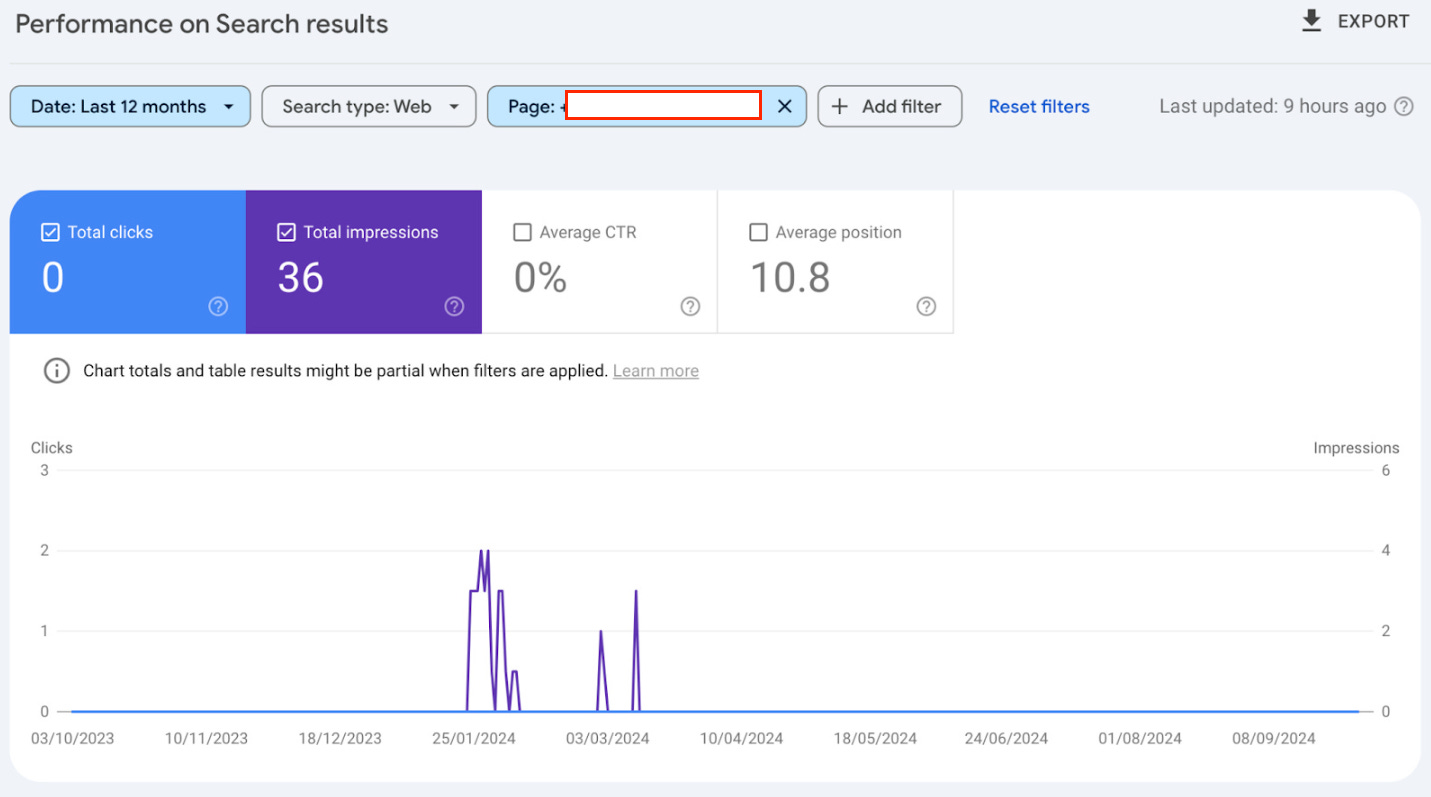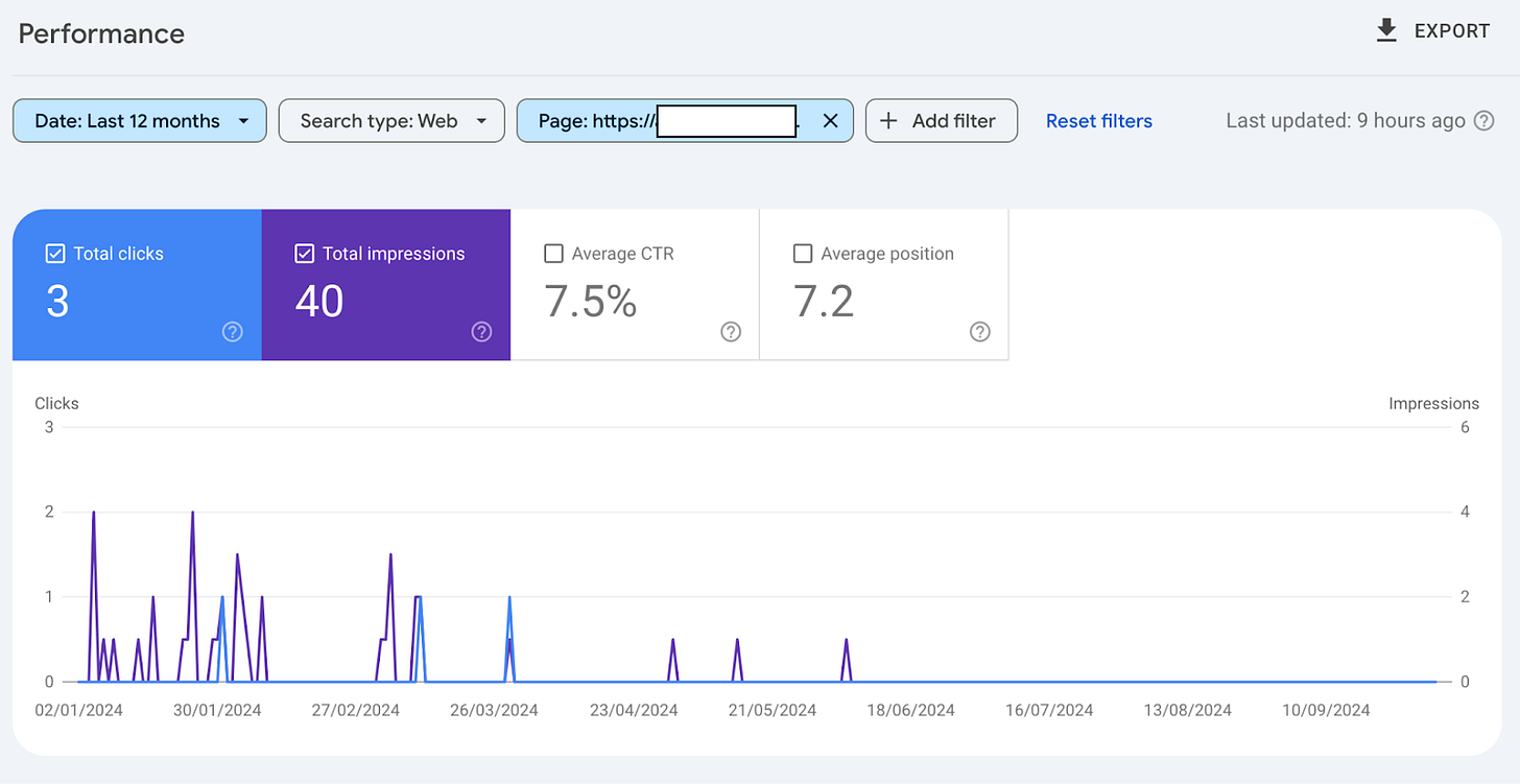 Finally, by checking the Search Performance report and filtering for the exact URL, you can see that it drove clicks and impressions, showing that it was indexed and could appear in search results.