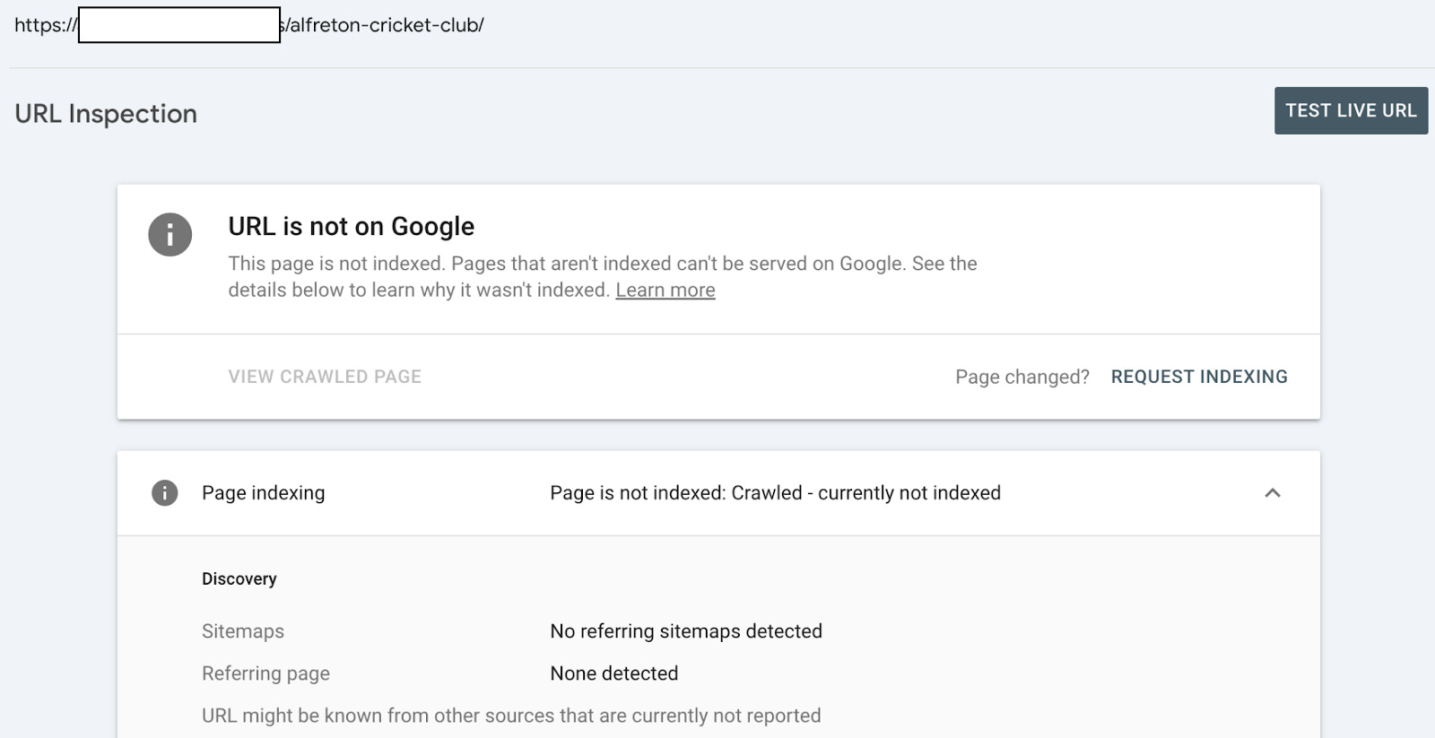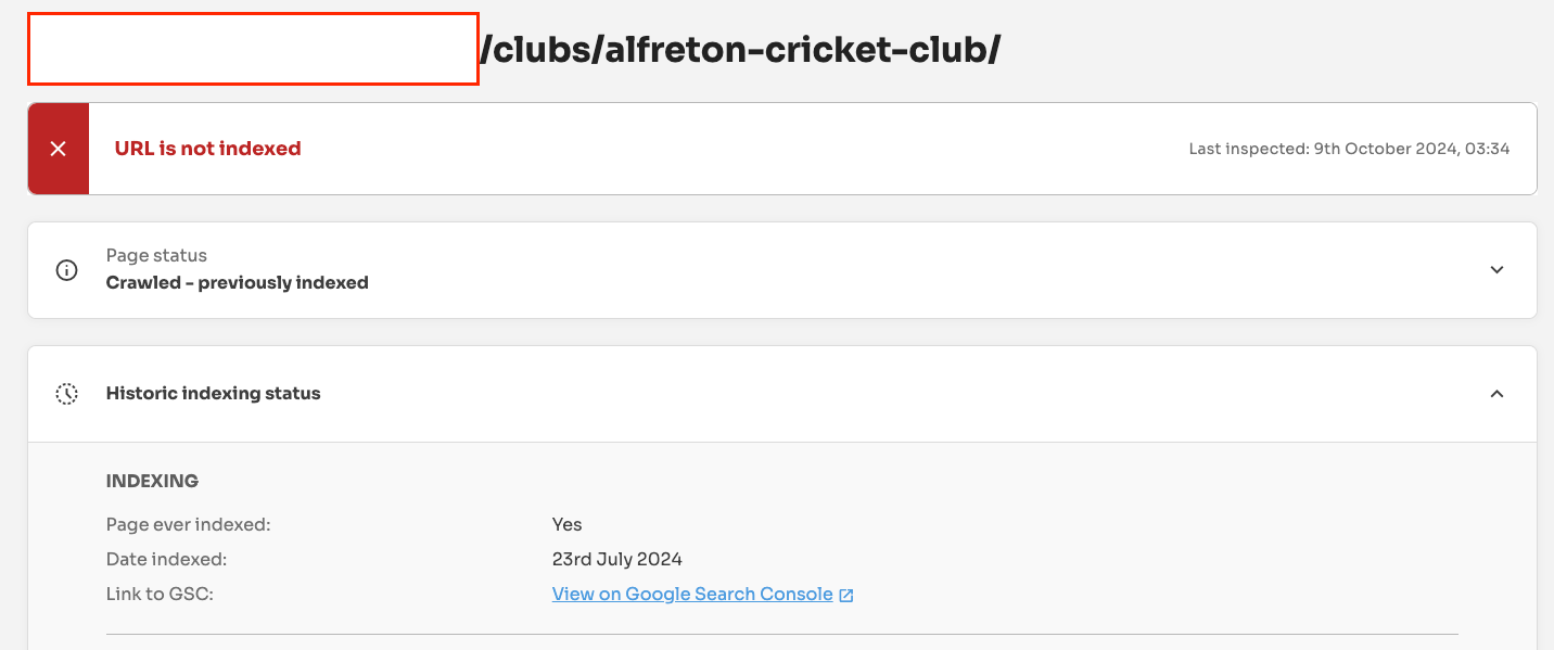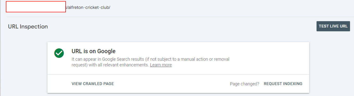 As you can see below, the URL Inspection status for the /alfreton-cricket-club/ is ‘crawled - currently not indexed’.