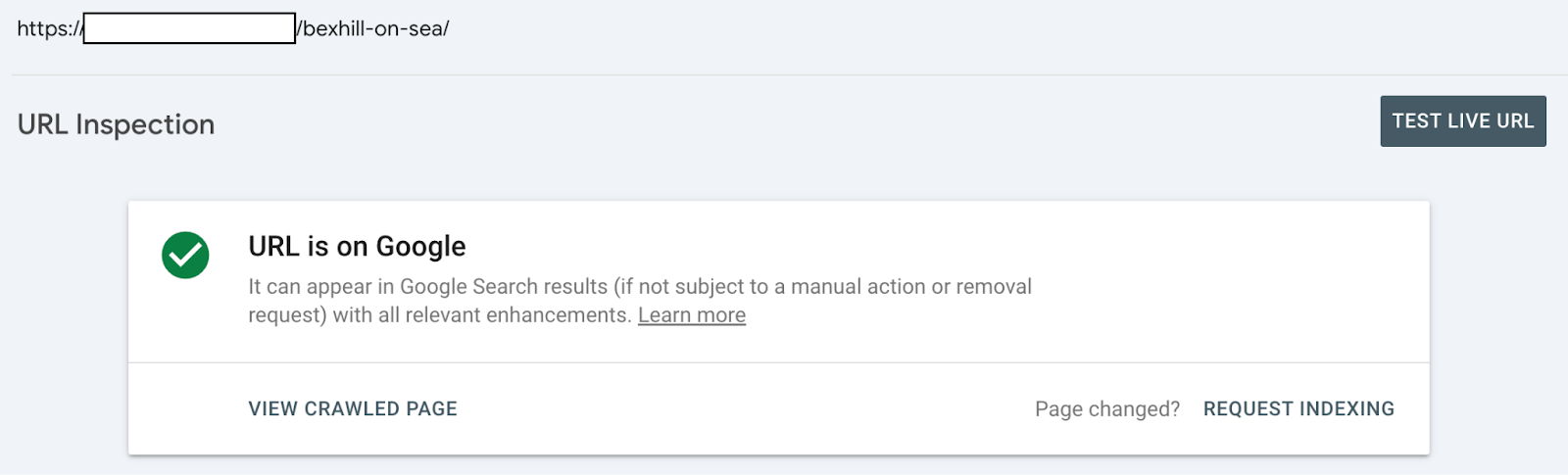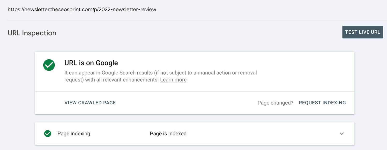 We can confirm the page was indexed by opening up the historic URL Inspection report.