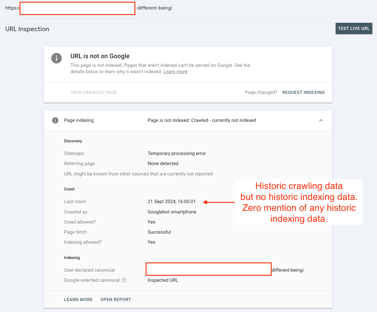 We even link to your GSC account's historic URL Inspection report on the switch date. The screenshot below shows that this page was indexed.
