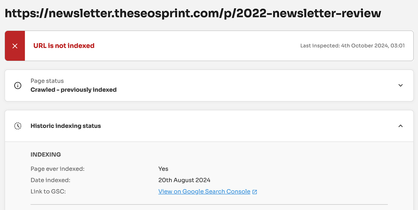 Hopefully, this newsletter has inspired you to dig deeper into ‘crawled - currently not indexed’ reports. And identify which pages have been ‘crawled - previously indexed’.