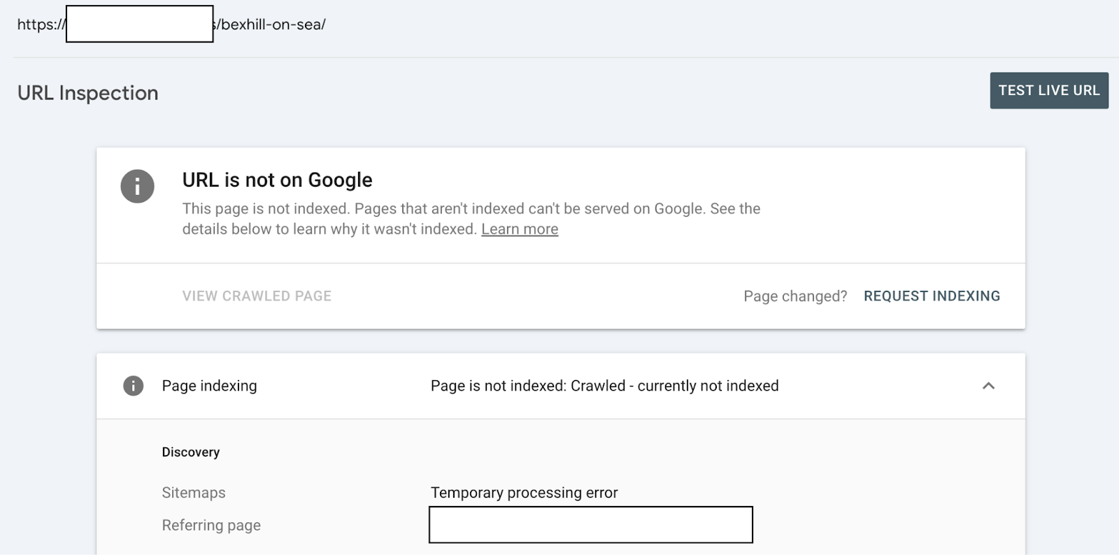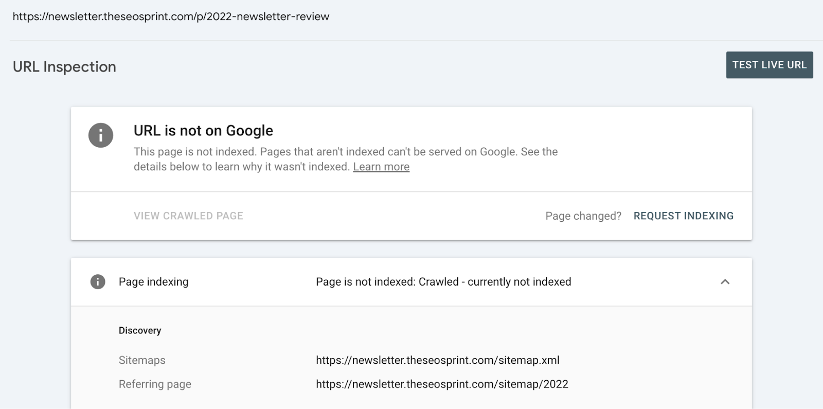 When checking the URL Inspection tool in GSC, we see it has the ‘crawled—currently not indexed’ index status.
