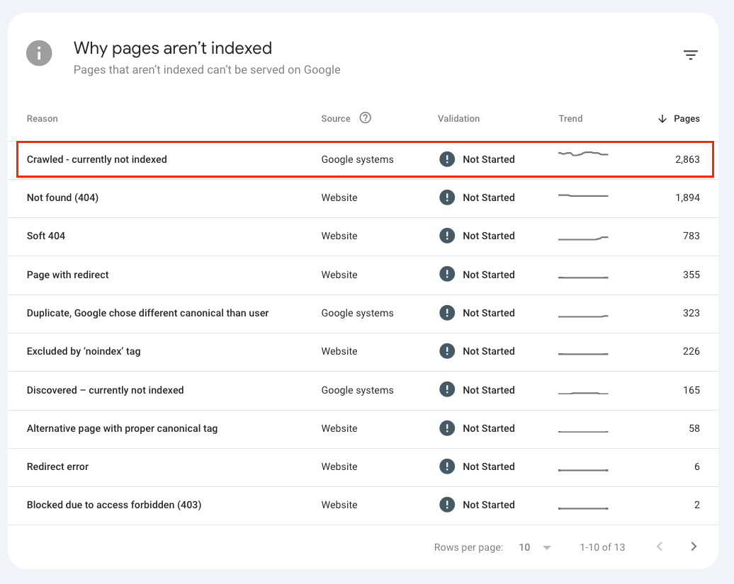Crawled - currently not indexed: Pages that have been crawled but never been indexed by Google.