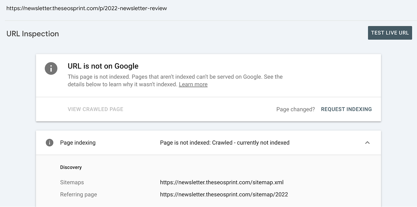 If you were to check the page URL in the URL Inspection report you can see that it is reporting ‘crawled - currently not indexed’.