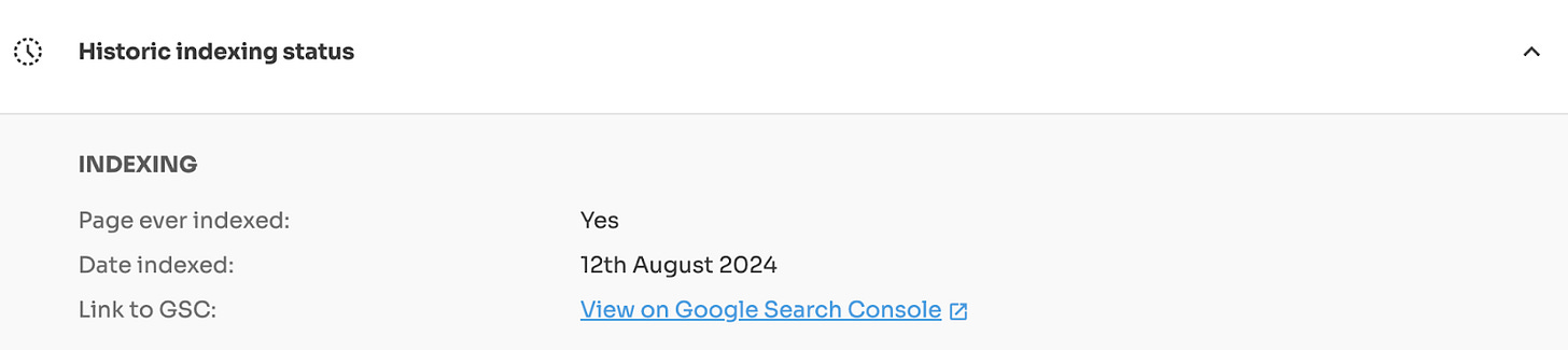 Thanks to the Index Insight (the Google index monitoring tool) we track if a page was historically indexed in Google. And we even provide the exact date it switch from ‘submitted and indexed’ to ‘crawled - currently not indexed’ (20th August 2024).